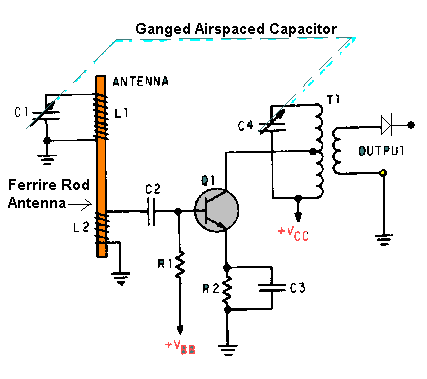 single transistor RF amplifier stage, ferrite rod antenna