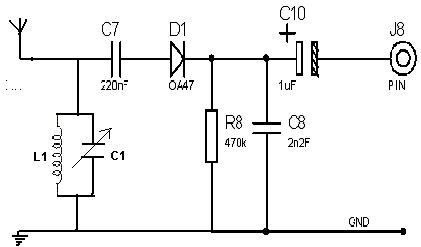 diode AA121, to the audio stage via the bias network C8 R1 and
