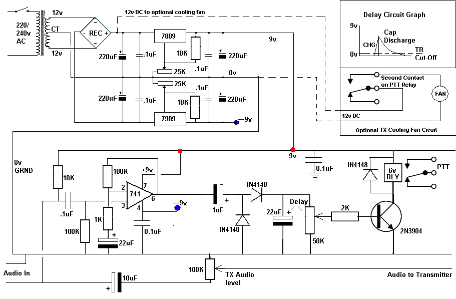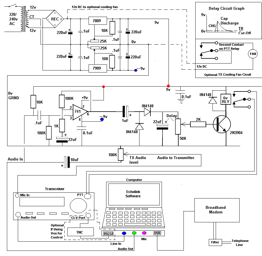 Ever wished you could find a reliable VOX PTT circuit. I designed this circuit with Echolink in mind, but it will work equally as well with repeaters, an echolink circuit using this VOX PTT design is shown further down the page, the audio from the receiver is taken via the PTT Board where the level being sent to the TX mic in can be adjusted by the 100k pot (TX Audio level), a small amount of audio is tapped off and fed via the .1uF capacitor to pin 3 on the 741 op amp where it is amplified and the output on pin 6 fed via a 1uF electrolytic cap to the delay network, and then via a 2K resistor to a 2N3904 transistor which turns on when the signal is driven into the base, thus causing the 6v relay to close. (More Below). This circuit is very stable and works extremely well, its simple to build and can be run off batteries if needed, but I would recommend using the PSU shown as the circuit very quickly flattens a pair of PP3 batteries. The Delay network made up of a 50K pot and 22uF cap as shown can be changed to suit your own needs, but I found these values work very well and can delay TX switch off by up to 30seconds more than enough. The principle is that the 22uF capacitor in the delay circuit is charged by the rectified signal from the two IN4148 diodes, and the discharge rate of the cap is controlled by the 50k pot, on a pre-determined voltage level the 2N3904 transistor will turn off and open the relay hence dropping the PTT line. You will also see top right under the delay schematic a circuit to include a cooling fan for the transmitter, the relay used for the PTT should have a second pole on it (Normal) and this pole is used to switch the cooling fan on during transmit, it will switch off again when the rig goes to receive mode, a good quality relay should be used, and the fan attached to the rigs heat sink, this keeps the rig nice and cool at all times, the fan can be any low current 12v type and the one I used was a PC CPU cooling fan with its own little heat sink, this lends itself very well for attaching to the rigs heat sink, that seems to work very well. Below then is all you need to make this circuit work with Echolink, as you can see it does everything you need if you intend working the set up in VOX mode only, But I have included in the circuit the way to connect a TNC controller as well, just incase you want to use echolink to switch the TX on instead of using the VOX line at any time.